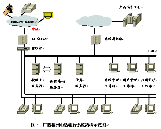 廣西工行推出的第一套銀行呼叫中心系統(tǒng)是在潤聲VX綜合信息系統(tǒng)開發(fā)平臺(UNIX版)上,在較短時間內開發(fā)成功,首先在梧州分行開通運行,獲得用戶的一致好評,并希望與潤聲公司進一步合作。該系統(tǒng)的結構如圖4所示。