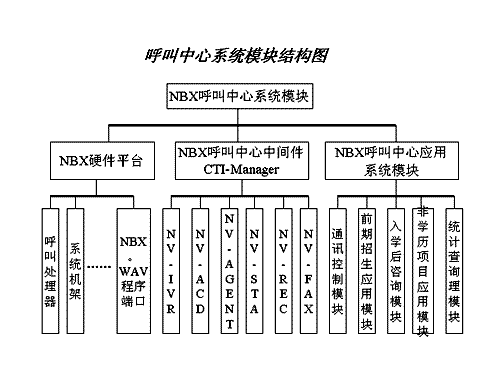 。。此呼叫中心系統(tǒng)主要由三大部分組成:美國3COM公司的NBX產(chǎn)品為系統(tǒng)平臺,及其配套的中間件產(chǎn)品CTI-Manager和上層第三方訂制的教育行業(yè)應(yīng)用軟件。根據(jù)需求,應(yīng)用軟件由五個功能模塊組成:通訊控制模塊、前期招生應(yīng)用模塊、入學(xué)后咨詢應(yīng)用模塊、非學(xué)歷項目應(yīng)用模塊、統(tǒng)計查詢模塊。系統(tǒng)模塊結(jié)構(gòu)圖如下: