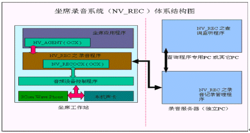 NV-REC 專用錄音系統(tǒng)與傳統(tǒng)的使用錄音板卡對(duì)坐席(電話)并線錄音的方式截然不同,由于3Com IPCC的所有坐席服務(wù)均是通過(guò)安裝在坐席終端上的軟件電話,通過(guò)聲卡、耳機(jī)來(lái)實(shí)現(xiàn)與客戶的電話溝通的。我們是直接監(jiān)測(cè)軟件電話,從聲卡設(shè)備通道中直接形成實(shí)時(shí)語(yǔ)音通話的標(biāo)準(zhǔn)WAV文件,從而完成對(duì)坐席的全程錄音功能。