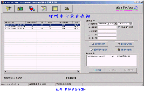 錄音系統(tǒng)提供多種多樣的查詢方式,可坐席工號(hào)、分機(jī)號(hào)、客戶來(lái)電號(hào)碼、來(lái)電時(shí)間、業(yè)務(wù)號(hào)等查詢、回放錄音。并可將錄音與業(yè)務(wù)數(shù)據(jù)形成一一對(duì)應(yīng)關(guān)系,回放錄音的同時(shí)可顯示該坐席當(dāng)時(shí)處理的相關(guān)業(yè)務(wù)內(nèi)容。