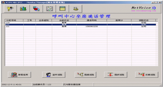 系統(tǒng)提供實(shí)時(shí)直觀的監(jiān)控界面,并提供各類實(shí)用的坐席監(jiān)控方法如:監(jiān)聽、強(qiáng)插、強(qiáng)拆等功能操作,從而實(shí)現(xiàn)了對(duì)各應(yīng)用坐席的強(qiáng)有力的監(jiān)控、管理功能。
