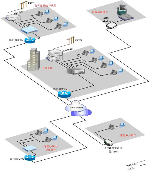 - 采用3COM NBX系統(tǒng)我們可以為用戶提供移動的、靈活的辦公電話系統(tǒng),本系統(tǒng)的遠(yuǎn)程Internet接入采用ADSL或?qū)>方式。