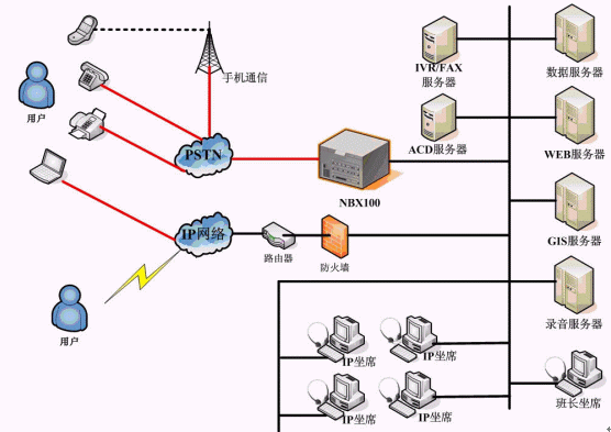 求助中心熱線系統(tǒng)采用華為-3COM 的 NBX100 網(wǎng)絡(luò)交換機(jī)作為呼叫接入設(shè)備,基于純IP交換技術(shù),座席電話全部采用IP話機(jī),部署方式靈活。求助中心系統(tǒng)主要負(fù)責(zé)受理市民投訴,并派發(fā)到相關(guān)二級網(wǎng)絡(luò)單位;網(wǎng)絡(luò)單位系統(tǒng)主要負(fù)責(zé)處理中心下發(fā)的投訴單據(jù),并進(jìn)行反饋,同時(shí),網(wǎng)絡(luò)單位也可自行受理投訴,并進(jìn)行相應(yīng)的上傳和下發(fā),多級網(wǎng)絡(luò)單位之間可實(shí)現(xiàn)級聯(lián)。為了簡化單據(jù)中轉(zhuǎn)流程,求助中心系統(tǒng)在網(wǎng)絡(luò)派單的基礎(chǔ)上,還結(jié)合自動傳真、短信群發(fā)等技術(shù),提供了自動傳真派單、自動短信派單等多種單據(jù)派發(fā)功能,極大的提高了單據(jù)處理效率。