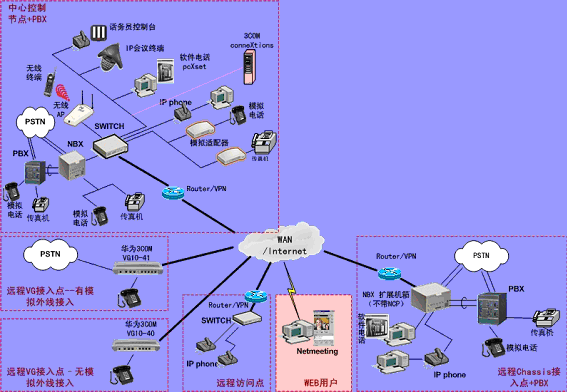 ③.遠程接入的辦公室不再需要專用的 PBX, 只需要將3Com NBX電話終端接入到WAN網(wǎng)中,就能地實現(xiàn)在WAN或Internet上與3Com