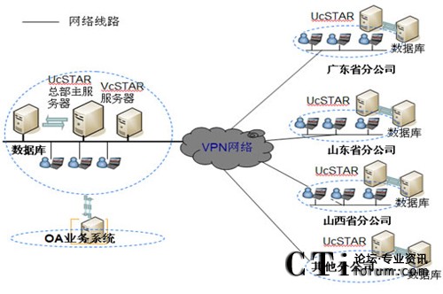 在公司總部部署主UcSTAR服務(wù)器,全國省級(jí)分公司分別部署一套子UcSTAR服務(wù)器,組成星型結(jié)構(gòu)公司內(nèi)部的溝通與協(xié)作系統(tǒng)。