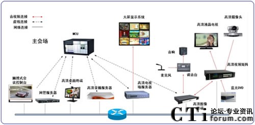其中迪威高清視頻會(huì)議系統(tǒng)主要由:一臺(tái)高清MCU、10個(gè)高清硬件終端、18個(gè)高清桌面終端、一臺(tái)高清錄播服務(wù)器以及一個(gè)網(wǎng)管系統(tǒng)組成。如圖所示: