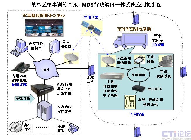 為了加強現(xiàn)代化軍隊的建設,某軍區(qū)在其軍分區(qū)的指揮訓練基地,使用先進的技術(shù),搭建了一套由幾十輛軍事指揮車組成的作戰(zhàn)指揮訓練系統(tǒng),其中的語音通信指揮系統(tǒng)部分,采用了美國Zed-3公司最先進的基于IP技術(shù)的MDS80行政調(diào)度一體化通信系統(tǒng),解決了訓練基地的指揮中心大樓的原有通信系統(tǒng),與室外的訓練基地各輛指揮車之間,通過基地無線網(wǎng)絡及衛(wèi)星備份鏈路提供的IP通道,實現(xiàn)語音的指揮調(diào)度通信,達到訓練基地要求的最佳的語音指揮調(diào)度通信效果。