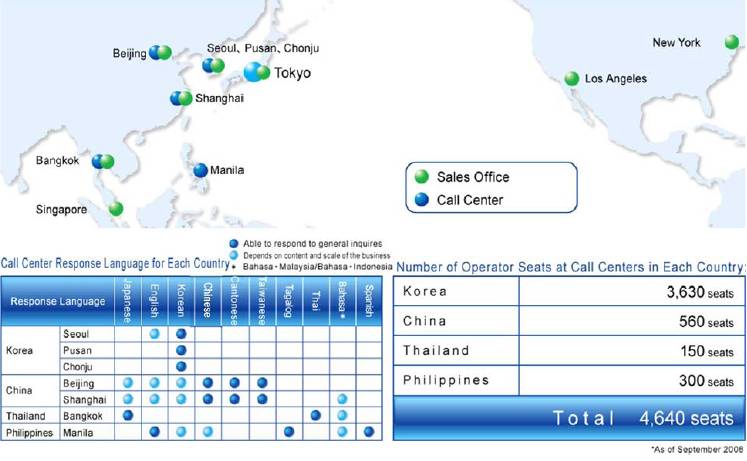 transcosmos的目標(biāo)是通過(guò)擴(kuò)大服務(wù)回應(yīng)的語(yǔ)言和持續(xù)強(qiáng)化架構(gòu)提供一站式全球呼叫中心服務(wù)來(lái)滿(mǎn)足客戶(hù)需要。同時(shí),transcosmos通過(guò)全球范圍內(nèi)發(fā)展我們的外呼最佳服務(wù)工具“MO3”,已經(jīng)成功在日本、中國(guó)和韓國(guó)啟動(dòng),也積極地作為客戶(hù)的全球IT伙伴支持他們的全球發(fā)展。我們的目標(biāo)是在2011年前海外呼叫中心服務(wù)達(dá)到整個(gè)transcosmos集團(tuán)銷(xiāo)售額的10%以及呼叫中心業(yè)務(wù)銷(xiāo)售量的30%。