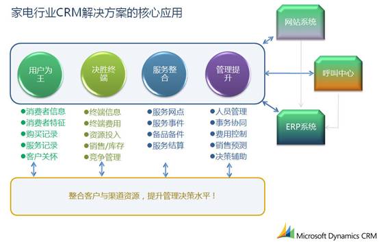 Techsun家電行業(yè)CRM解決方案基于Microsoft Dynamics CRM這一優(yōu)秀平臺(tái),實(shí)現(xiàn)了對(duì)客戶、渠道資源的統(tǒng)一客戶,對(duì)銷售、市場(chǎng)、服務(wù)職能的全面支持,滿足了復(fù)合渠道整合的管理需求。Microsoft Dynamics CRM基于SOA架構(gòu),具有易集成的特點(diǎn),滿足了家電行業(yè)多種復(fù)雜異構(gòu)系統(tǒng)的集成需求。