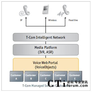 T-Com在2000年進(jìn)入競(jìng)爭(zhēng)激烈的受托管理業(yè)務(wù)市場(chǎng),并且很快從一個(gè)自產(chǎn)IVR系統(tǒng)過渡到開放標(biāo)準(zhǔn)的VoiceXML平臺(tái)。T-Com的標(biāo)語——“讓生活簡(jiǎn)單”——證明了要求給它的客戶及其每天1,000,000個(gè)呼叫提供7x24、可擴(kuò)展的和可靠的受托管理電話服務(wù)。但是,T-Com很快意識(shí)到需要額外的技術(shù)來補(bǔ)充這個(gè)新的VoiceXML平臺(tái)。