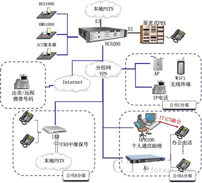 震有科技NC5200系列IP-PBX可作為核心軟交換設(shè)備放置在公司總部及重要分支機(jī)構(gòu),通過(guò)現(xiàn)有互聯(lián)網(wǎng)或VPN互聯(lián)。從屬分支機(jī)構(gòu)或分支機(jī)構(gòu)下屬辦事處分布式布放IAD/AG等接入模塊,經(jīng)IP網(wǎng)絡(luò)聯(lián)接至NC5200系列IP-PBX。可實(shí)現(xiàn)公司內(nèi)部通話零話費(fèi),撥打分支機(jī)構(gòu)所在地市話無(wú)長(zhǎng)途費(fèi)等。更可通過(guò)NC5200系列建立呼叫中心,提升企業(yè)形象。