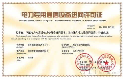 CTI論壇(ctiforum)12月22日消息(記者 張潔):日前從深圳市震有科技有限公司獲悉,震有科技數(shù)字程控調度交換機榮獲電力專用通信設備進網(wǎng)許可證。