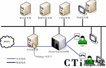 整個呼叫中心分存在兩種通訊方式:語音方式和數(shù)據(jù)方式。語音方式指的是傳統(tǒng)的電話線路,數(shù)據(jù)方式則是指的是各個應用程序間的通訊交互線路。管理語音硬件的有Dialogic語音卡—負責整個系統(tǒng)的語音接入,并處理自動語音的相關(guān)動作;Alcatel-lucent