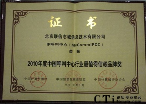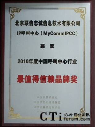 CTI論壇(ctiforum)11月1日消息(記者 潘婷婷):近日,在國家信息化專家咨詢委員會的指導下,作為中國信息化發(fā)展重要推動力量的中國計算機報社、中國計算機行業(yè)協(xié)會、中國信息化推進聯(lián)盟等國家級權(quán)威媒體及國家信息化領(lǐng)域一級權(quán)威機構(gòu),共同組織開展“2010中國行業(yè)信息化讀者選擇獎評選”,重點展示信息化在行業(yè)應(yīng)用中的優(yōu)秀應(yīng)用案例、產(chǎn)品及解決方案。由中國計算機報社組織業(yè)內(nèi)專家,在經(jīng)過歷時3個月的產(chǎn)品征集、方案論證、專家評審后,北京聯(lián)信志誠信息技術(shù)有限公司(簡稱MyComm公司),其核心產(chǎn)品MyCommIPCC獨占2010年中國呼叫中心行業(yè)最值得信賴品牌獎。