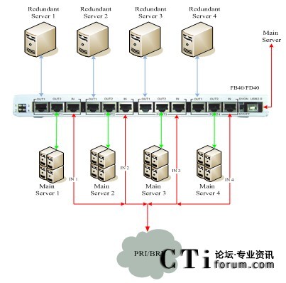 正常通信時(shí),BRI\PRI線路信號(hào)流向主服務(wù)器,進(jìn)行正常語(yǔ)音通信(BRI\PRI-OUT2),當(dāng)主服務(wù)器發(fā)生意外斷電,不能正常使用時(shí),BRI\PRI線路信號(hào)流向備份服務(wù)器(BRI\PRI-OUT1),保證正常通信。具體連接示意如下圖所示: