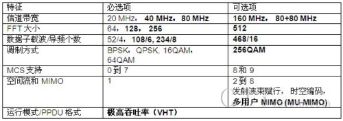 表3:IEEE802.11ac 的主要特性(黑體字是ac新增加的)