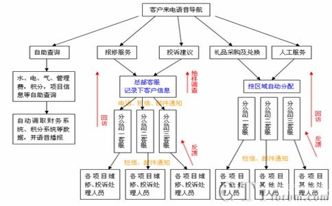如上圖所示,客戶通過手機(jī)、電話、傳真機(jī)、IP話機(jī)等撥入XX物業(yè)全國統(tǒng)一服務(wù)熱線后,可根據(jù)系統(tǒng)語音導(dǎo)航選擇自助查詢、報(bào)修服務(wù)、投訴建議、禮品采購及兌換、人工服務(wù)等業(yè)務(wù)?蛻魣(bào)修或投訴統(tǒng)一由總部受理,再轉(zhuǎn)給各分公司所屬項(xiàng)目處理;客戶選擇采購及人工服務(wù),系統(tǒng)將根據(jù)客戶來電歸屬地將其就近接入當(dāng)?shù)匚飿I(yè)公司客服座席處理,如電話長時間未被接聽,則系統(tǒng)會自動把電話再轉(zhuǎn)到總部受理?偛繉⒍〞r采集各分部座席錄音、通話記錄等相關(guān)管理數(shù)據(jù)。