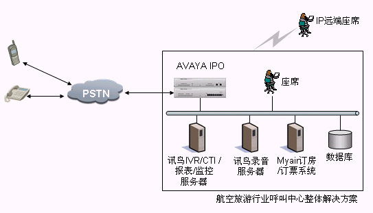 本方案采用AVAYA IP OFFICE系列交換機(jī),通過(guò)訊鳥(niǎo)中間件控制整個(gè)呼叫中心的電話呼入、呼出。它支持多種聯(lián)絡(luò)渠道,包括語(yǔ)音、交互式自動(dòng)語(yǔ)音應(yīng)答(IVR)、傳真、電子郵件、web、短消息等,同時(shí)利用Myair航空管理系統(tǒng)來(lái)完成整個(gè)業(yè)務(wù)流程。