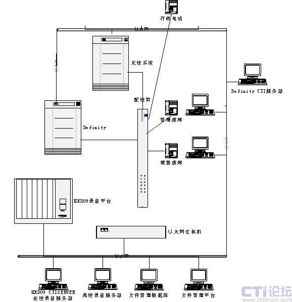 - HXD09 CTI服務(wù)器(在線錄音服務(wù)器):HXD09交換機(jī)系統(tǒng)服務(wù)器,開發(fā)平臺(tái)。完成系統(tǒng)部分控制,在線錄音等功能。