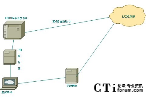 HXD09交換機(jī)通過EM接口與350M的語音線連接,當(dāng)需要呼叫某一無線終端時,由座席端發(fā)起呼叫請求到無線網(wǎng)關(guān),當(dāng)獲取到無線網(wǎng)關(guān)返回的語音通道后,HXD09交換機(jī)將和350M系統(tǒng)對應(yīng)的語音通道連接起來,實現(xiàn)有線座席和無線終端之間的通話,并可對通話進(jìn)行錄音;座席也可插入到無線終端或者某一集群之間,實現(xiàn)監(jiān)聽或者插話,這一過程同樣可以全程錄音。