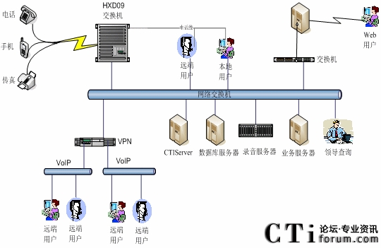 本系統(tǒng)物理結構由交換機、CTI服務器、IVR(交互式語音應答、服務器、業(yè)務代表座席(邏輯上分為:普通業(yè)務代表座席、專家座席等)、班長座席、統(tǒng)計維護管理工作站、因特網(WEB)服務器、電子郵件(EMAIL)服務器、數據庫/應用服務器、錄音留言工作站、領導查詢工作站、業(yè)務網關服務器、通信網關、網絡系統(tǒng)等構成。