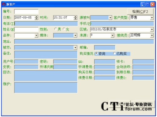 注:對(duì)于登記日期一直到客戶名這一段條件的查詢(即上圖中所有的那些查詢條件),都得點(diǎn)擊客戶名欄對(duì)應(yīng)的那個(gè)查找按鈕才能進(jìn)行有效的查找,否則若點(diǎn)擊其它按鈕(姓名電話直接檢索對(duì)應(yīng)的查找除外),都會(huì)提示“請(qǐng)輸入****”這種錯(cuò)誤信息。而點(diǎn)擊最后一個(gè)查找,也是無效的,會(huì)轉(zhuǎn)到客戶管理中空白信息欄(即什么也查不到)。