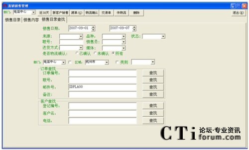 例子:查找2007年9月5日到2007年9月6日間,登記時(shí)間為早上7:30到晚上18:20,購(gòu)買了操盤手軟件的杭州市顧客的查找設(shè)置如下: