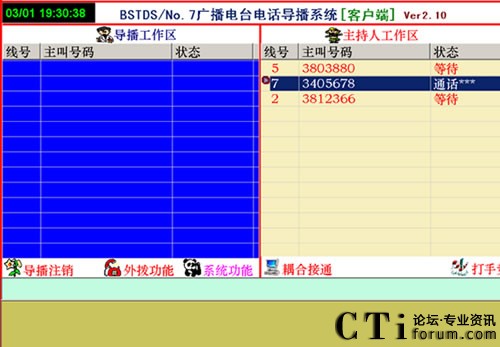 1、直播節(jié)目開播時(shí),參與者打進(jìn)電話,由導(dǎo)播把參與電話導(dǎo)入直播區(qū),這時(shí)直播區(qū)顯示參與者的電話號(hào)碼,主持人可以任意的選擇參與者進(jìn)行通話或掛機(jī)。