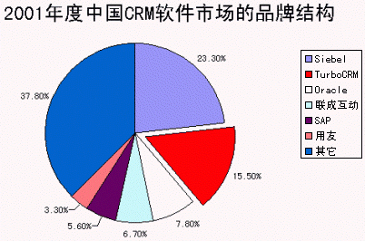 2002年2月27日,賽迪資訊顧問公司(CCID)正式發(fā)布了《2001-2002年中國管理軟件市場(chǎng)研究年度報(bào)告》。TurboCRM信息科技有限公司在進(jìn)入中國市場(chǎng)短短一年多的時(shí)間里,憑借其成熟的軟件產(chǎn)品、突出的銷售業(yè)績和專業(yè)的品牌形象,榮獲年度CRM市場(chǎng)銷售客戶數(shù)第一,市場(chǎng)份額僅次于全球最大的CRM軟件廠商--Siebel公司,位居第二。
