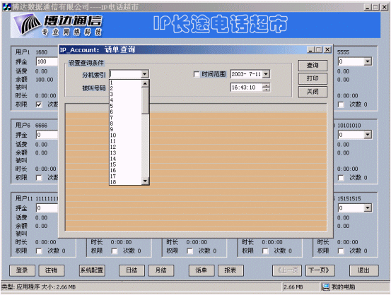 博達公司在IP電話認證的基礎上開發(fā)的IP電話計費計費系統(tǒng),實現(xiàn)了用戶管理、卡用戶批量生成、費率設置、折扣設置、話單查詢、帳務查詢、管理統(tǒng)計、運營分析等功能,為電信運營商的運營和企業(yè)用戶對IP電話的內(nèi)部管理和服務提供了有利條件。