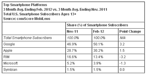 按截至今年2月份的三個(gè)月的平均數(shù)計(jì)算,美國智能手機(jī)用戶數(shù)超過1.04億人,相比截止去年11月的三個(gè)月的平均數(shù)增長14%。谷歌Android操作系統(tǒng)在美國手機(jī)市場的份額超過50%,相比去年同期上升了17個(gè)百分點(diǎn);蘋果iOS操作系統(tǒng)排名第二,其市場份額為30.2%(與去年同期相比上升了5個(gè)百分點(diǎn));其后依次是RIM黑莓操作系統(tǒng)的13.4%,微軟Windows