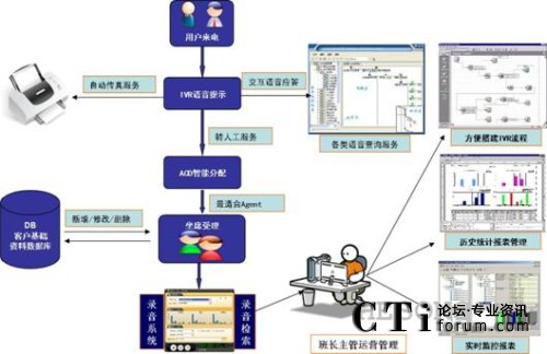 用戶電話呼入時,系統(tǒng)通過自動語音應(yīng)答的方式,實現(xiàn)用戶服務(wù)的自動導(dǎo)航。交互式語音應(yīng)答功能自動播放問候和語音提示信息,根據(jù)用戶按鍵選擇提供自助服務(wù)或者呼叫中心人工服務(wù)。呼叫中心提供人工服務(wù)后還可以為特定的用戶需求提供人工轉(zhuǎn)IVR自動語音服務(wù),比如114查詢到電話、地址后,電信10000號呼叫中心提供的語音播放服務(wù)。