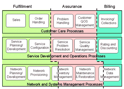 在TMF的模型中,從功能上來(lái)看,OSS主要包括三大功能:業(yè)務(wù)開通(Service Fulfillment);業(yè)務(wù)保障(Service Assurance);計(jì)費(fèi),又稱業(yè)務(wù)計(jì)量(Service