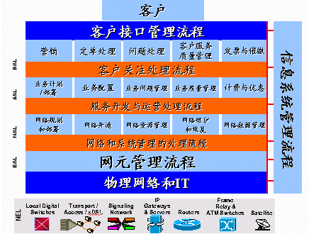 Assurance)的定義是,提供量化的測(cè)量指標(biāo),確保網(wǎng)絡(luò)服務(wù)能夠達(dá)到客戶所訂購(gòu)的要求。(Service Usage)的定義是,測(cè)量電信網(wǎng)絡(luò)中各種業(yè)務(wù)的使用情況,計(jì)算處理使用電信業(yè)務(wù)的應(yīng)收費(fèi)用,并對(duì)電信業(yè)務(wù)的收費(fèi)過(guò)程提供支持。這是從縱向的角度來(lái)看,而從橫向的角度來(lái)看,從電信管理的角度來(lái)看,OSS主要處在三個(gè)管理層面:客戶服務(wù)層;業(yè)務(wù)管理層;網(wǎng)絡(luò)管理層。