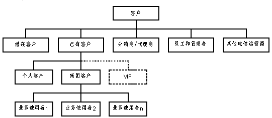 同時(shí),客戶服務(wù)中心的服務(wù)對(duì)象進(jìn)一步擴(kuò)大,按照是否已經(jīng)使用該電信運(yùn)營(yíng)商提供的電信業(yè)務(wù)將客戶劃分為:潛在客戶、已有客戶。這里的潛在客戶并不針對(duì)某一具體的電信業(yè)務(wù),而是針對(duì)電信運(yùn)營(yíng)商整體而言。其中,已有客戶又分為個(gè)人客戶和集團(tuán)客戶。集團(tuán)客戶內(nèi)部存在多個(gè)業(yè)務(wù)使用者,這些業(yè)務(wù)使用者本身也是客服系統(tǒng)的客戶。分銷/代理商代為發(fā)展電信運(yùn)營(yíng)商的客戶,同時(shí)他們也可以單獨(dú)作為一種特殊客戶享有客服系統(tǒng)提供的服務(wù)。在個(gè)人客戶和集團(tuán)客戶中,均會(huì)有一部分成為特殊的VIP。此外,對(duì)客服系統(tǒng)來(lái)說(shuō),電信運(yùn)營(yíng)商的員工和管理者也是"客戶";同時(shí),從網(wǎng)間互聯(lián)和網(wǎng)間結(jié)算的角度,其它運(yùn)營(yíng)商也應(yīng)該按照客戶來(lái)對(duì)待。