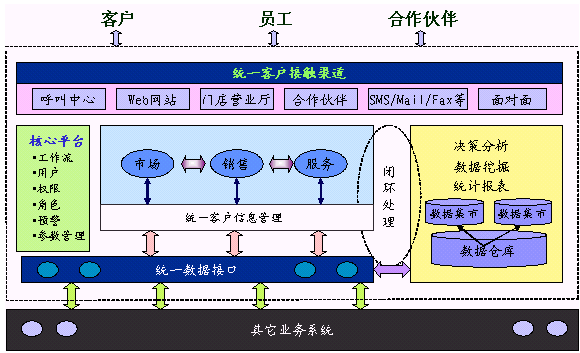 HOLLYCRM(合力金橋軟件公司)推出的HollyCRM是全面集成的客戶關(guān)系管理解決方案,覆蓋協(xié)作型CRM、運(yùn)營型CRM和分析型CRM的全部范疇。HollyCRM通過telephone、Email、Fax、WAP、Web、PDA、Face to Face等各種各樣渠道與客戶互動,通過市場營銷(Marketing)、銷售(Sales)和服務(wù)(Service)等業(yè)務(wù)流程的管理,將客戶的各種背景信息、偏好、行為習(xí)慣、交易數(shù)據(jù)、信用狀況等信息收集并整合在一起,再將這些運(yùn)營數(shù)據(jù)和外來的市場數(shù)據(jù)經(jīng)過整合和變換,裝載進(jìn)數(shù)據(jù)倉庫(Data Warehouse)后,運(yùn)用OLAP和數(shù)據(jù)挖掘(Data Mining)等技術(shù)來從數(shù)據(jù)中分析和提取相關(guān)規(guī)律、模型和趨勢,把有關(guān)客戶信息和知識在整個企業(yè)內(nèi)得到有效的流轉(zhuǎn)和共享,并進(jìn)一步轉(zhuǎn)化為企業(yè)的戰(zhàn)略規(guī)劃和科學(xué)決策,用于提高在所有渠道上同客戶交互的有效性和針對性,把合適的產(chǎn)品和服務(wù),通過合適的渠道,在適當(dāng)?shù)臅r(shí)候,提供給適當(dāng)?shù)目蛻,從而?shí)現(xiàn)利潤的最大化。