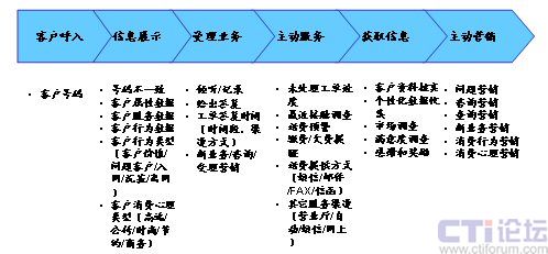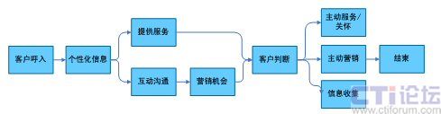 在上面的流程中,將一次客戶接觸,轉變?yōu)橐淮稳娴目蛻艋訖C會,通過對客戶信息360度的洞察和客戶的互動溝通,在為客戶提供基本服務的同時,根據客戶的基本資料、歷史消費數據等,挖掘客戶的隱性需求,從而有選擇的開展客戶關懷、客戶信息收集、客戶維系、主動營銷活動。下面以一個電信運營商的客戶呼入流程為例,說明在一個以客戶為中心的客戶接觸流程中,坐席代表可以開展的客戶接觸活動(圖4)。