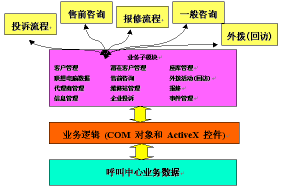 在此中心指導(dǎo)思想之下,惠普咨詢又結(jié)合聯(lián)想電腦公司的業(yè)務(wù)特點,所設(shè)計的呼叫中心涵蓋了廣泛功能,包括: