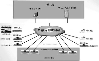 在公司總部安裝一套寬帶視訊交換平臺ViewPoint 8620及管理系統(tǒng),在公司總部建設(shè)一個大型視訊會議室作為主會場,視訊終端采用ViewPoint 8030mBox。北京另外兩個小會議室配置普通視訊終端ViewPoint 8020plus,外地30個辦事處會議室各配置一臺ViewPoint 8020plus視訊終端。2套ViewPoint OpenEye視訊終端安裝于領(lǐng)導(dǎo)桌面,可以用于接入會議、召集會議,或者內(nèi)部IP話等。本系統(tǒng)總共包括一臺ViewPoint8620視訊交換平臺,一臺ViewPoint 8030mBox視訊終端和32臺ViewPoint 8020plus視訊終端,兩套領(lǐng)導(dǎo)用桌面終端ViewPointOpenEye。