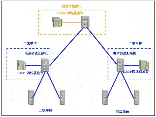 當(dāng)前國內(nèi)許多行業(yè)由于行業(yè)的業(yè)務(wù)特點,在原有的電話網(wǎng)應(yīng)用中,電話會議作為常用的交流手段發(fā)揮著重要作用。這些行業(yè)的電話會議業(yè)務(wù),主要是通過電話會議匯接機(jī)的方式實現(xiàn):會議召集單位通過電話會議匯接機(jī)(以下簡稱匯接機(jī))通過專線、撥號等方式連通下級單位(以下簡稱二級單位)的匯接機(jī),二級單位的匯接機(jī)通過專線、撥號等方式連通所轄單位(以下簡稱三級單位)的會場電話。這樣通過多級匯接機(jī)級連的方式實現(xiàn),主持單位和二、三級單位間的電話網(wǎng)連通,利用匯接機(jī)實現(xiàn)廣播、三方通話、調(diào)度發(fā)言單位等會議功能。