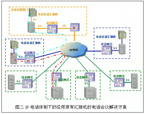 伴隨著IP網(wǎng)的建設(shè)和VoIP電話系統(tǒng)標(biāo)準(zhǔn)的日益完善,許多行業(yè)、部門開始在建設(shè)IP數(shù)據(jù)網(wǎng)的同時,結(jié)合原有電話專網(wǎng)的改造,著手建設(shè)IP電話網(wǎng)絡(luò)。在IP電話網(wǎng)上實現(xiàn)原有的電話會議業(yè)務(wù)也就隨之提到日程上來。華為公司結(jié)合IP電話的特點和保護(hù)用戶已有投資的角度,提出延用電話會議匯接機(jī)和采用華為專用IP電話會議控制系統(tǒng)兩套解決方案: