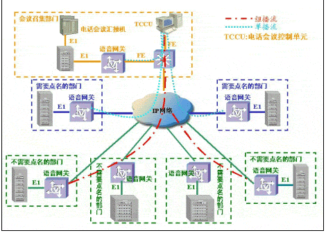 采用原有的會議電話架構(gòu),只是話音的長途連接由模擬專線等改為IP傳輸。方案由于采用原有電話會議匯接機(jī),保護(hù)了用戶的原有投資。缺點是在召開多級會議電話時,由于語音信號首先在召集單位語音網(wǎng)關(guān)進(jìn)行壓縮,經(jīng)IP傳輸后,在二級單位語音網(wǎng)關(guān)解壓縮還原為模擬話音,再經(jīng)二級單位的語音網(wǎng)關(guān)二次壓縮,經(jīng)IP網(wǎng)傳輸后,在三級單位的語音網(wǎng)關(guān)上二次解壓縮,導(dǎo)致語音信號多次壓縮/還原,對語音質(zhì)量損傷較大。