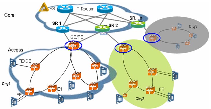 綜合接入主要關(guān)注語(yǔ)音和少量寬帶業(yè)務(wù)和專(zhuān)線,上行接口一般是E1和FE/GE。傳統(tǒng)窄帶語(yǔ)音業(yè)務(wù)、TDM專(zhuān)線等或MSAN使用于窄帶交換機(jī)組網(wǎng)的時(shí)候采用E1上行方式,其它時(shí)候采用FE/GE上行。接入層面采用的承載網(wǎng)設(shè)備必須同時(shí)能夠支持E1和FE/GE接入,因此承載網(wǎng)設(shè)備必須具備多業(yè)務(wù)傳輸特性,傳統(tǒng)SDH設(shè)備,傳統(tǒng)LANSwitch設(shè)備無(wú)法滿足組網(wǎng)需求。