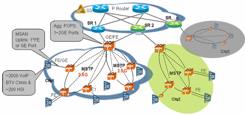 MSAN已經(jīng)逐漸成為基于IP架構(gòu)的下一代電信網(wǎng)建網(wǎng)的主要接入方式,近幾年越來(lái)越多的固網(wǎng)運(yùn)營(yíng)商普遍采用綜合接入(MSAN)建網(wǎng)模式,如英國(guó)的最大固網(wǎng)運(yùn)營(yíng)商英國(guó)電信的21CN網(wǎng)絡(luò),中國(guó)的最大固網(wǎng)運(yùn)營(yíng)商中國(guó)電信、中國(guó)網(wǎng)通,巴西的最大固網(wǎng)運(yùn)營(yíng)商Telemar等。而MSTP單一平臺(tái)具備支持MSAN接入的所有業(yè)務(wù)的承載要求,且成本最低。華為公司MSTP設(shè)備具有強(qiáng)大的數(shù)據(jù)接入?yún)R聚及傳送特性,并通過(guò)Metro