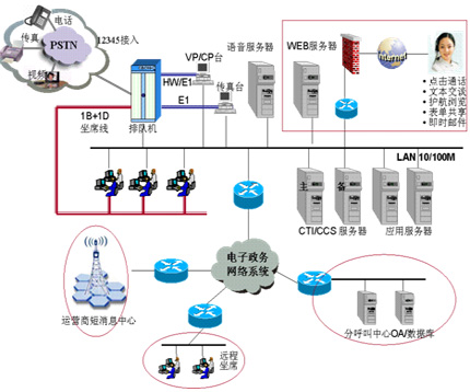 華為12345政府熱線系統(tǒng)解決方案,是一個集語音技術(shù)、通信技術(shù)、計算機網(wǎng)絡(luò)、數(shù)據(jù)庫技術(shù)于一體,支持電話、傳真、電子郵件、Web等多種媒體接入方式的呼叫中心解決方案。該系統(tǒng)充分考慮了政府服務(wù)熱線的現(xiàn)狀及存在的問題,并結(jié)合了政府特點的運作模式,是華為公司在多年呼叫中心開發(fā)合作工作經(jīng)驗積累基礎(chǔ)上推出的解決方案。整個系統(tǒng)整體結(jié)構(gòu)如下: