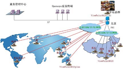 中國遠洋(集團)公司全球會議電視系統(tǒng)覆蓋全國13個分部和全球8個分公司,系統(tǒng)主會場在中遠集團公司總部。系統(tǒng)采用ISDN、E1、IP混合組網,使用了一套ViewPoint 8620視訊交換平臺、20套ViewPoint8020plus視訊終端和3套Openeye桌面終端,實現(xiàn)了中遠(集團)公司和全球所有分支機構之間的遠程會議和業(yè)務培訓。
