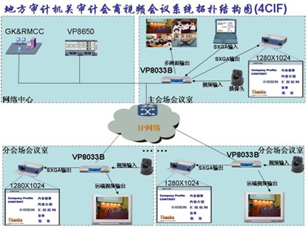 本系統在審計署機房配置網絡控制中心GK、多點資源管理系統和ViewPoint 8660 MCU設備。多點資源管理中心實現對MCU、電視會議和全網資源的統一調度,GK實現對IP終端入會時鑒權認證,在主會場會議室架設一臺ViewPoint 8033B分體式視訊終端。在各分會場會議室架設一臺ViewPoint 8033B分體式視訊終端;在所有會場各架設一臺標清攝像機、一個麥克風、一臺高清電視或一臺高清投影機。