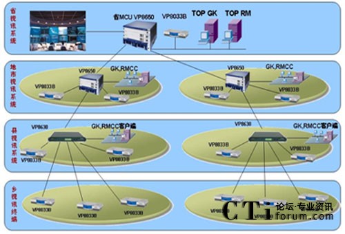 這是目前國內(nèi)最大的政府應(yīng)急視頻會(huì)議指揮系統(tǒng),現(xiàn)網(wǎng)可以借鑒的經(jīng)驗(yàn)很少,華為公司充分意識(shí)到該項(xiàng)目的重大意義,投入大量人力物力進(jìn)行網(wǎng)絡(luò)環(huán)境調(diào)研和客戶需求分析,經(jīng)過眾多專家和工程人員的反復(fù)論證,最終該套系統(tǒng)采取了分布式三級(jí)級(jí)聯(lián)組網(wǎng)結(jié)構(gòu)和四級(jí)分級(jí)分權(quán)管理模式,具有強(qiáng)大的備份能力和豐富的功能特性,在省和9個(gè)地市分別配置1臺(tái)8650MCU和1套管理軟件,在58個(gè)縣分別配置1臺(tái)8630 MCU,在1205個(gè)會(huì)議室分別配置1臺(tái)8033B終端。