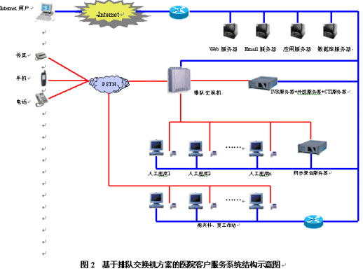 醫(yī)院客戶服務(wù)系統(tǒng)是一個(gè)集合電話語音、計(jì)算機(jī)網(wǎng)絡(luò)、數(shù)據(jù)庫等技術(shù)的綜合信息服務(wù)平臺,主要由自動(dòng)語音應(yīng)答系統(tǒng)、人工座席和數(shù)據(jù)庫系統(tǒng)三部分組成。