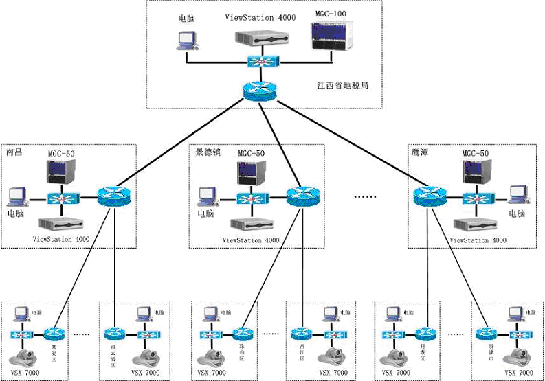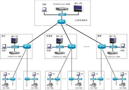 系統(tǒng)的具體設(shè)備配置為:在省局配備MGC--100一臺(tái),省局會(huì)議室使用POLYCOM公司VSX7000會(huì)議終端一臺(tái)及VS4000會(huì)議終端兩臺(tái);在南昌、景德鎮(zhèn)、九江等11個(gè)市局全部配備MGC-50各一臺(tái)以及POLYCOM公司VS4000會(huì)議終端各一臺(tái),VSX7000會(huì)議終端各若干臺(tái)(共131臺(tái)),從而實(shí)現(xiàn)整個(gè)視頻會(huì)議網(wǎng)絡(luò)的多點(diǎn)視頻會(huì)議功能。
